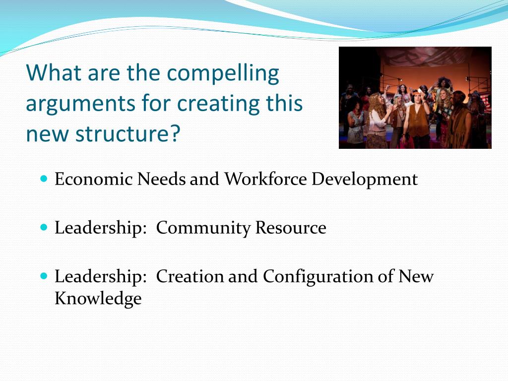 What are the compelling arguments for creating this new structure? • Economic Needs and Workforce Development • Leadership: Community Resource • Leadership: Creation and Configuration of New Knowledge