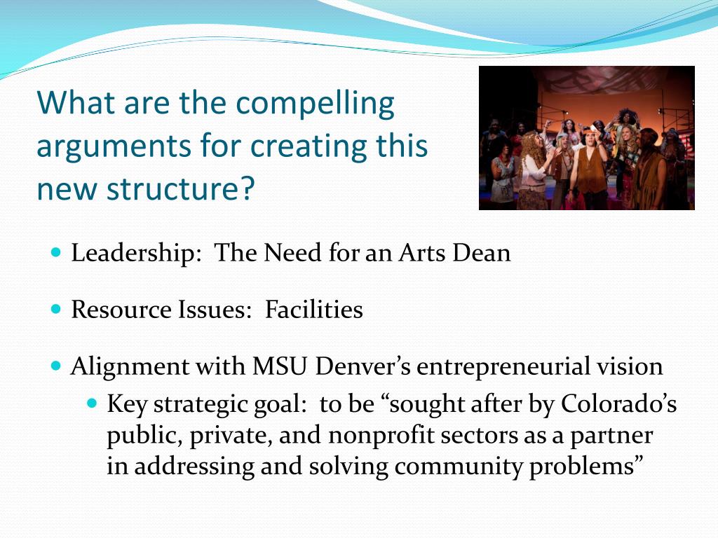 What are the compelling arguments for creating this new structure? • Leadership: The Need for an Arts Dean • Resource Issues: Facilities • Alignment with MSU Denver’s entrepreneurial vision • Key strategic goal: to be “sought after by Colorado’s public, private, and nonprofit sectors as a partner in addressing and solving community problems”