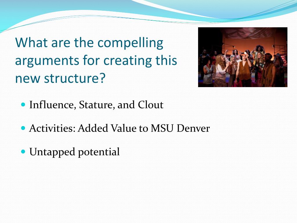What are the compelling arguments for creating this new structure? • Influence, Stature, and Clout • Activities: Added Value to MSU Denver • Untapped potential