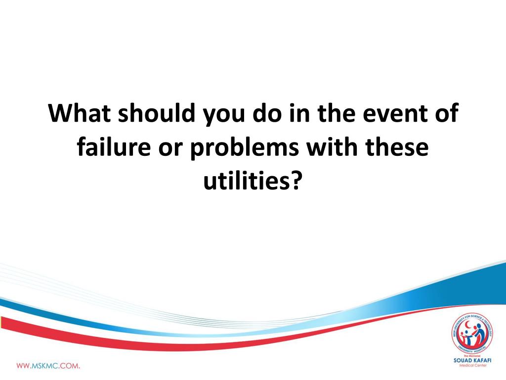 Utility Failure • Call Maintenance • Be careful around leaking steam; . • If you suspect a natural gas leak, do not turn on lights, electrical appliances, or other sources of ignition; open all windows. • Be aware of electrical hazards: • Do not use frayed/broken power cords. • The use of extension cords is prohibited. • All equipment should have hospital grade, grounded 3-prong plugs.