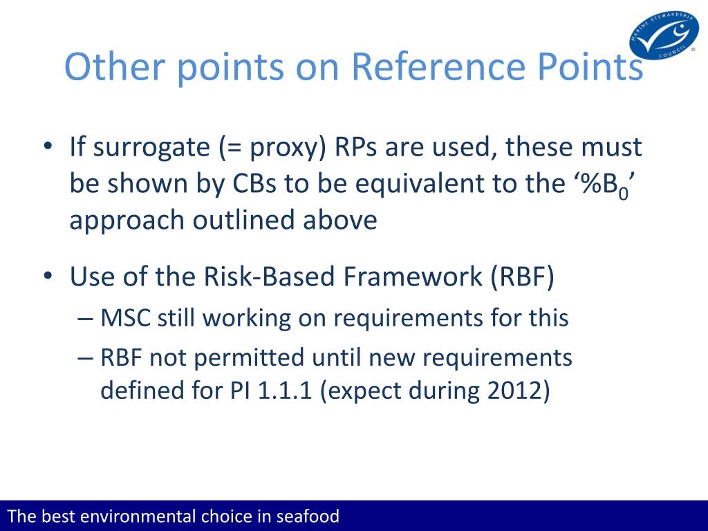 Other points on Reference Points • If surrogate (= proxy) RPs are used, these must be shown by CBs to be equivalent to the ‘%B0’ approach outlined above • Use of the Risk-Based Framework (RBF) • MSC still working on requirements for this • RBF not permitted until new requirements defined for PI 1.1.1 (expect during 2012)