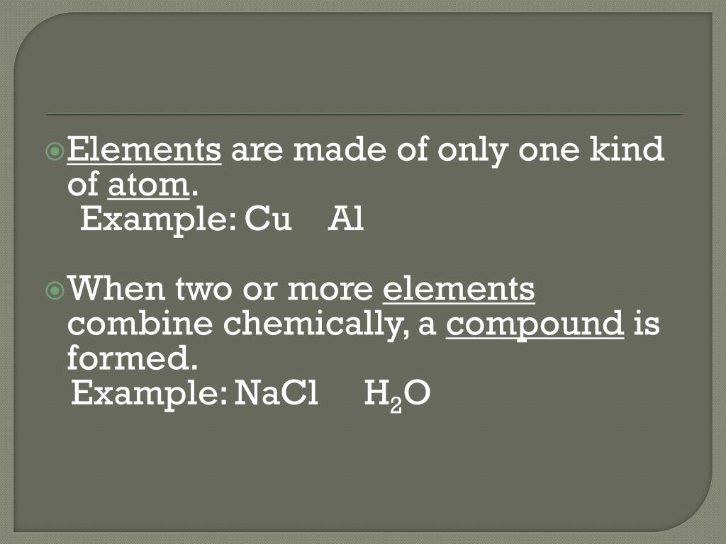Elements are made of only one kind of atom. Example: Cu Al When two or more elements combine chemically, a compound is formed. Example: NaCl H2O