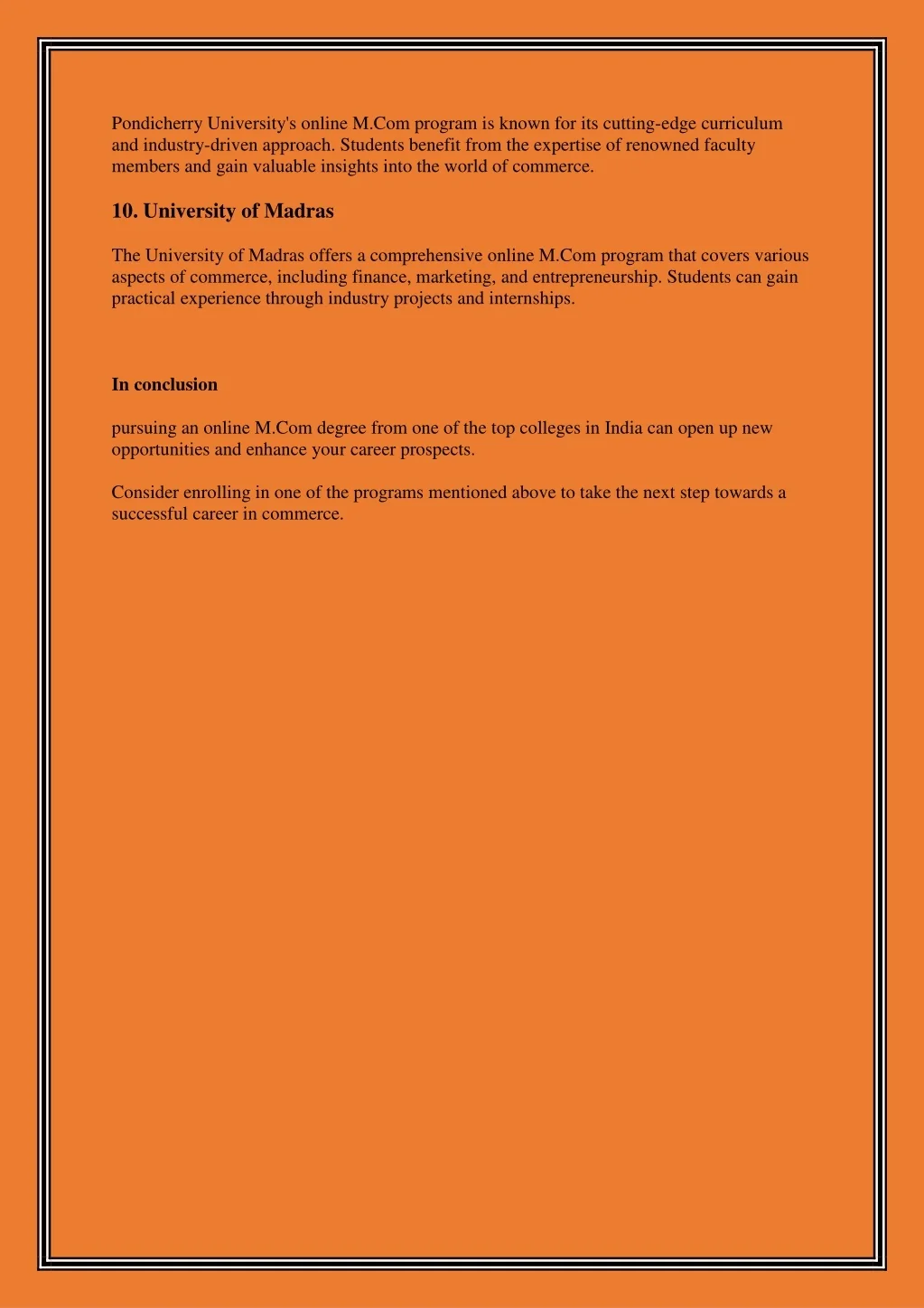 Pondicherry University's online M.Com program is known for its cutting-edge curriculum and industry-driven approach. Students benefit from the expertise of renowned faculty members and gain valuable insights into the world of commerce. 10. University of Madras The University of Madras offers a comprehensive online M.Com program that covers various aspects of commerce, including finance, marketing, and entrepreneurship. Students can gain practical experience through industry projects and internships. In conclusion pursuing an online M.Com degree from one of the top colleges in India can open up new opportunities and enhance your career prospects. Consider enrolling in one of the programs mentioned above to take the next step towards a successful career in commerce.