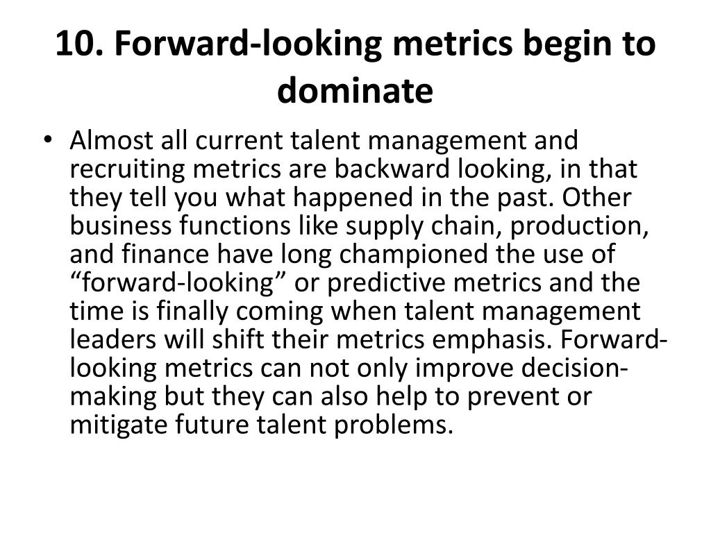 10. Forward-looking metrics begin to dominate • Almost all current talent management and recruiting metrics are backward looking, in that they tell you what happened in the past. Other business functions like supply chain, production, and finance have long championed the use of “forward-looking” or predictive metrics and the time is finally coming when talent management leaders will shift their metrics emphasis. Forward-looking metrics can not only improve decision-making but they can also help to prevent or mitigate future talent problems.