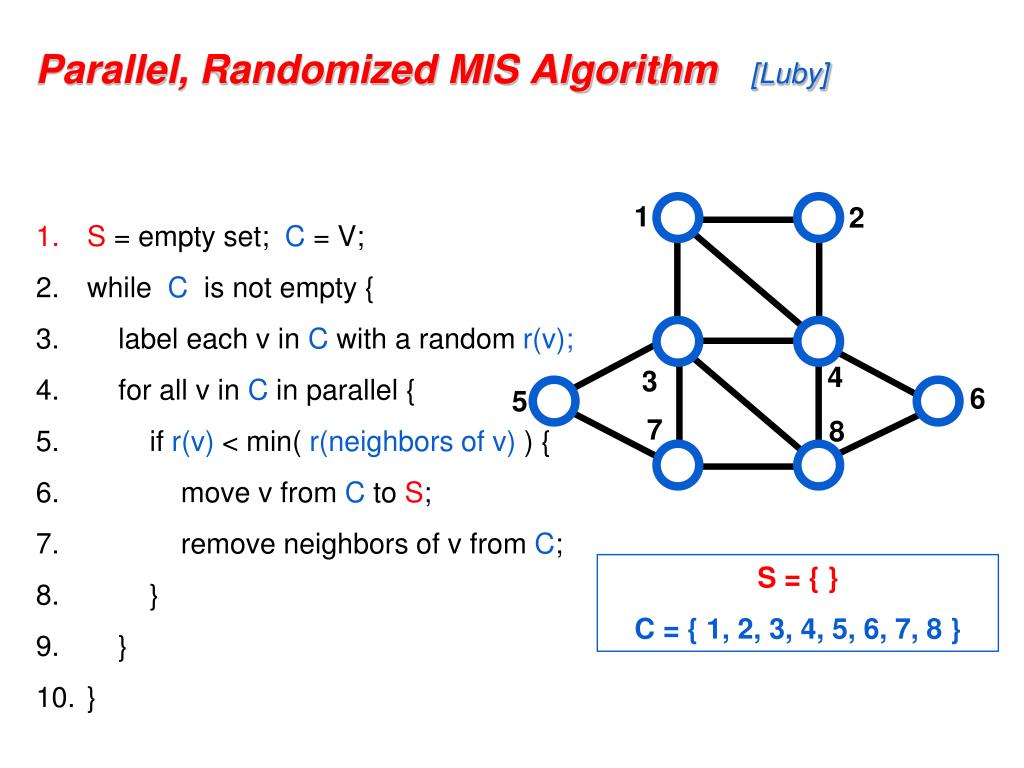 Parallel, Randomized MIS Algorithm [Luby] 1 2 • S = empty set; C = V; • while C is not empty { • label each v in C with a random r(v); • for all v in C in parallel { • if r(v) < min( r(neighbors of v) ) { • move v from C to S; • remove neighbors of v from C; • } • } • } 2.7 4 3 6 5 7 8 1.8 S = { 1, 5 } C = { 6, 8 }