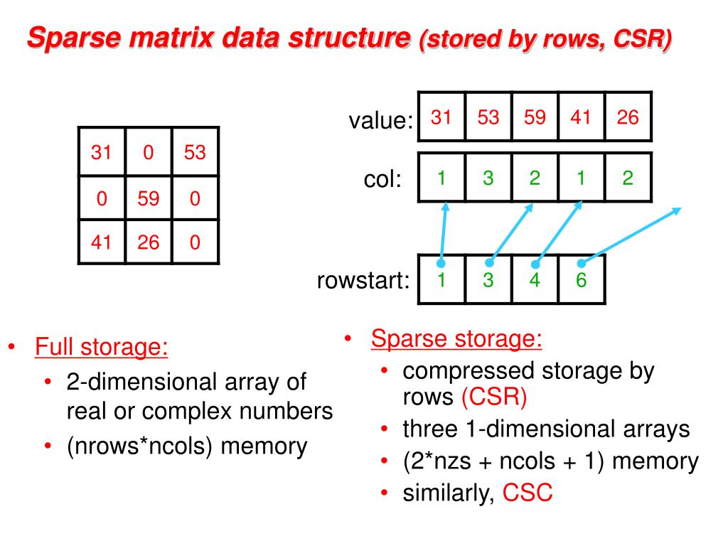 Sparse matrix data structure (stored by rows, CSR) value: • Full storage: • 2-dimensional array of real or complex numbers • (nrows*ncols) memory col: rowstart: • Sparse storage: • compressed storage by rows (CSR) • three 1-dimensional arrays • (2*nzs + ncols + 1) memory • similarly,CSC