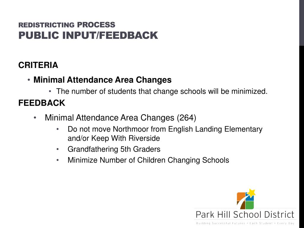 Redistricting processPublic INPUT/Feedback • CRITERIA • Minimal Attendance Area Changes • The number of students that change schools will be minimized. • FEEDBACK • Minimal Attendance Area Changes (264) • Do not move Northmoor from English Landing Elementary and/or Keep With Riverside • Grandfathering 5th Graders • Minimize Number of Children Changing Schools