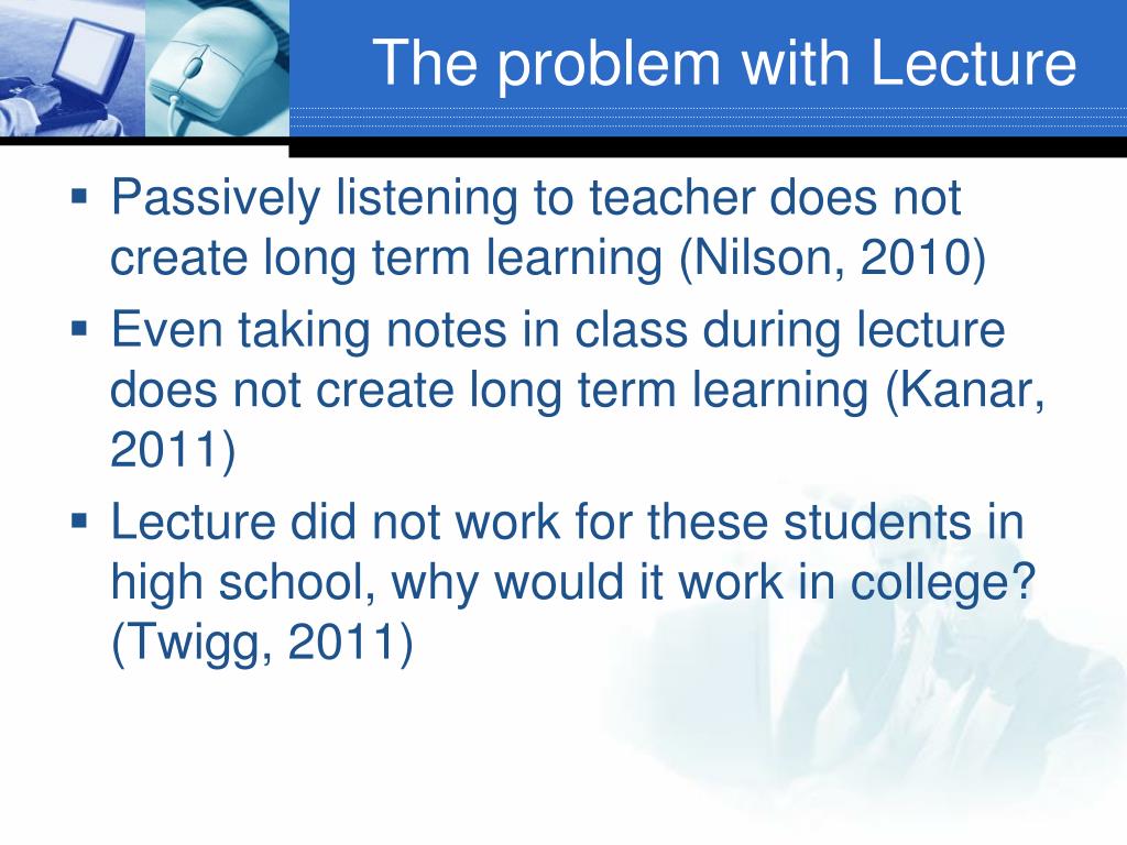The problem with Lecture • Passively listening to teacher does not create long term learning (Nilson, 2010) • Even taking notes in class during lecture does not create long term learning (Kanar, 2011) • Lecture did not work for these students in high school, why would it work in college? (Twigg, 2011)