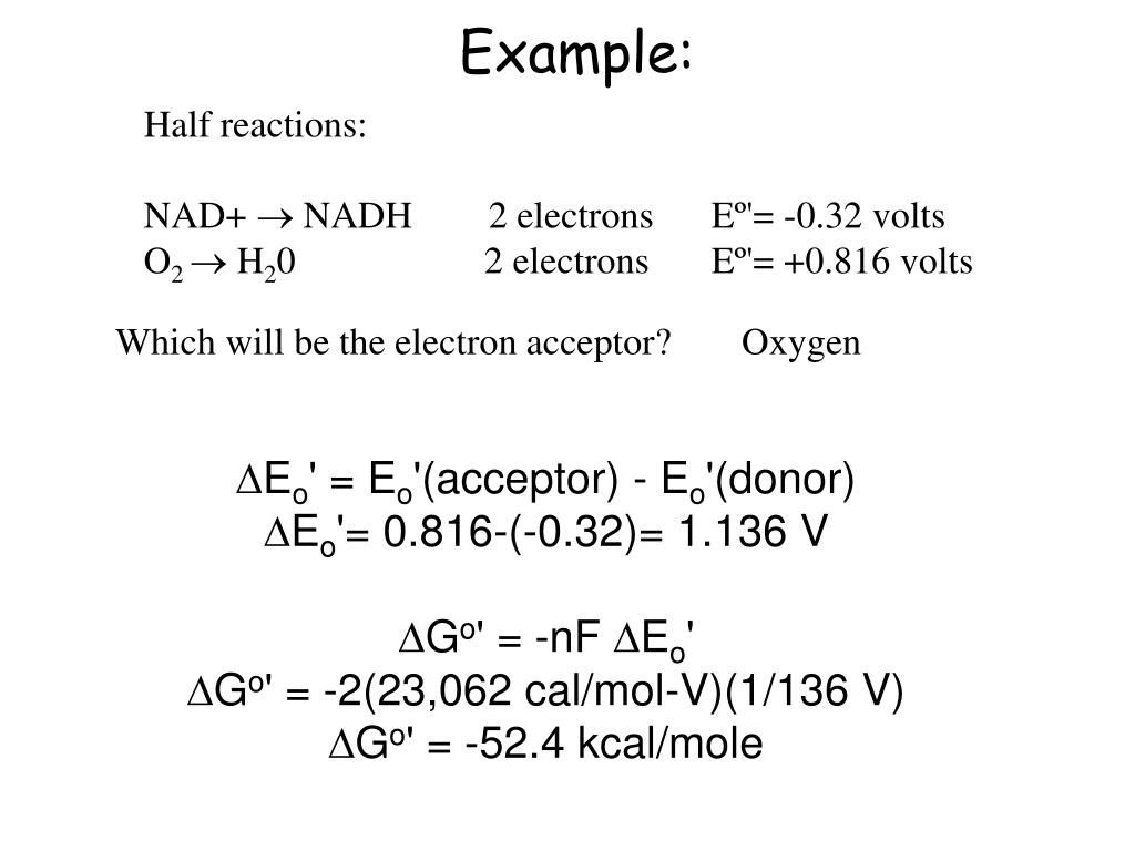 Example: Half reactions: NAD+ NADH 2 electrons Eº'= -0.32 volts O2 H20 2 electrons Eº'= +0.816 volts Which will be the electron acceptor? Oxygen Eo' = Eo'(acceptor) - Eo'(donor) Eo'= 0.816-(-0.32)= 1.136 V Go' = -nFEo' Go' = -2(23,062 cal/mol-V)(1/136 V) Go' = -52.4 kcal/mole
