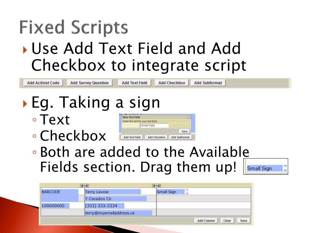 Fixed Scripts • Use Add Text Field and Add Checkbox to integrate script • Eg. Taking a sign • Text • Checkbox • Both are added to the Available Fields section. Drag them up!