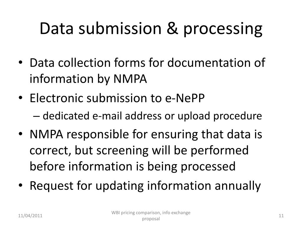 Data submission & processing • Data collection forms for documentation of information by NMPA • Electronic submission to e-NePP • dedicated e-mail address or upload procedure • NMPA responsible for ensuring that data is correct, but screening will be performed before information is being processed • Request for updating information annually WBI pricing comparison, info exchange proposal
