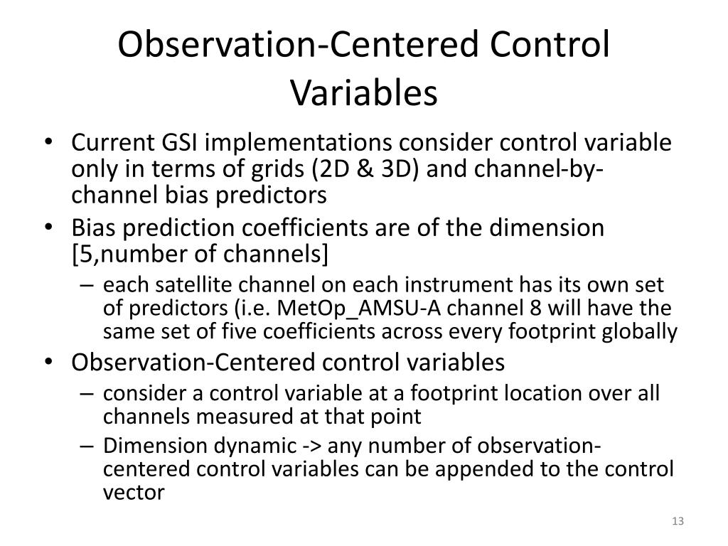Observation-Centered Control Variables • Current GSI implementations consider control variable only in terms of grids (2D & 3D) and channel-by-channel bias predictors • Bias prediction coefficients are of the dimension [5,number of channels] • each satellite channel on each instrument has its own set of predictors (i.e. MetOp_AMSU-A channel 8 will have the same set of five coefficients across every footprint globally • Observation-Centered control variables • consider a control variable at a footprint location over all channels measured at that point • Dimension dynamic -> any number of observation-centered control variables can be appended to the control vector