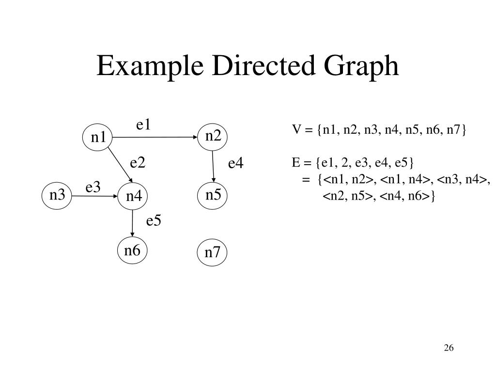 Example Directed Graph e1 V = {n1, n2, n3, n4, n5, n6, n7} E = {e1, 2, e3, e4, e5} = {<n1, n2>, <n1, n4>, <n3, n4>, <n2, n5>, <n4, n6>} n2 n1 e2 e4 e3 n3 n5 n4 e5 n6 n7