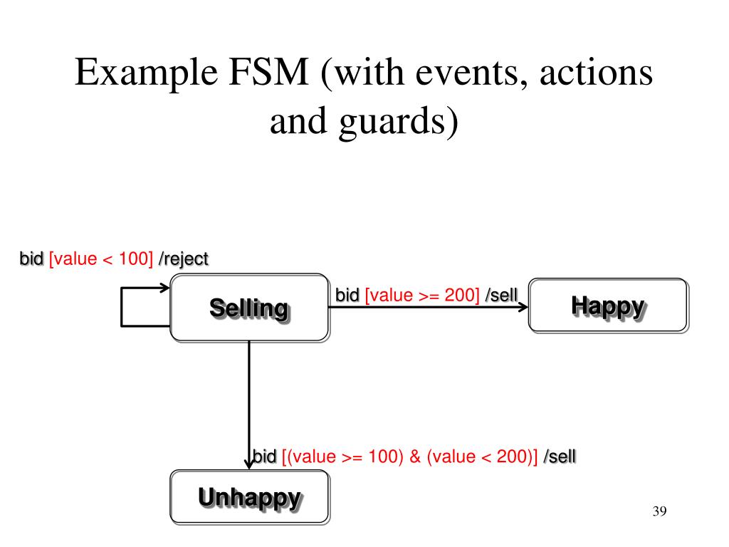 bid [value < 100] /reject Selling bid [value >= 200] /sell Happy bid [(value >= 100) & (value < 200)] /sell Unhappy Example FSM (with events, actions and guards)