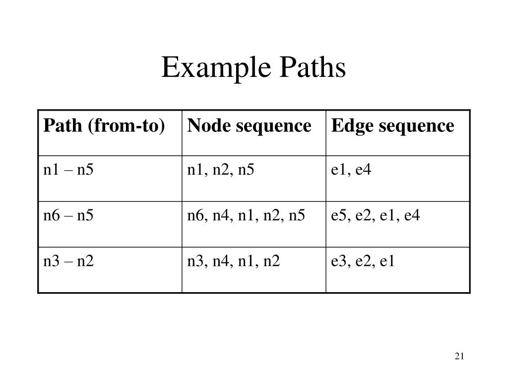 Paths • A path is a sequence of edges such that, for any adjacent pair of edges ei, ej in the sequence, the edges share a common node as an endpoint. • Paths can be described either as a sequence of edges, or as a sequence of nodes. • Paths are defined between a source node and a target node.