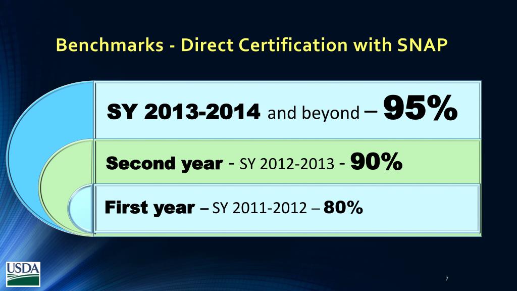 First year – SY 2011-2012 – 80% Benchmarks - Direct Certification with SNAP • SY 2013-2014 and beyond – 95% • Second year -SY 2012-2013 -90%
