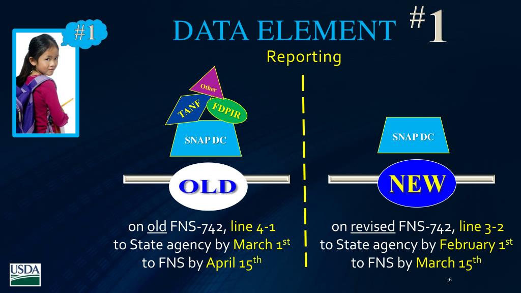 #1 #1 Other DATA ELEMENT .Reporting TANF FDPIR SNAP DC SNAP DC on old FNS-742, line 4-1 to State agency by March 1st to FNS by April 15th on revised FNS-742, line 3-2 to State agency by February 1st to FNS by March 15th