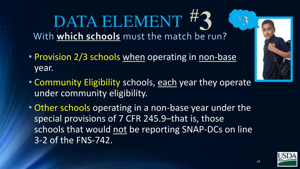 #3 DATA ELEMENT .Withwhich schoolsmust the match be run? #3 • Provision 2/3 schools whenoperating in non-base year. • Community Eligibility schools, each year they operate under community eligibility. • Other schools operating in a non-base year under the special provisions of 7 CFR 245.9–that is, those schools that would not be reporting SNAP-DCs on line 3-2 of the FNS-742.