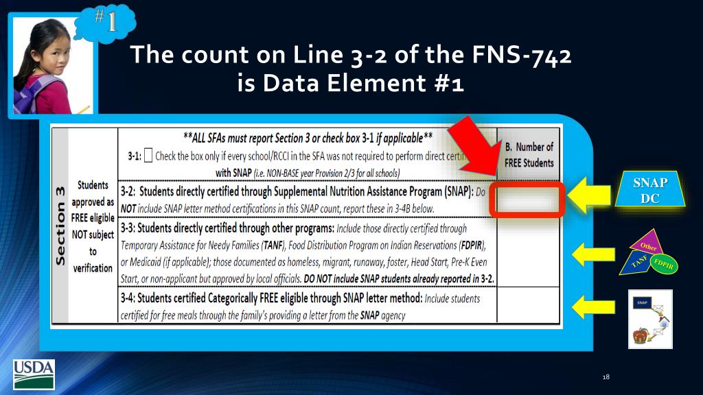Need to be able to separate out SNAP DC for Section 3 of the FNS-742 – Free, not subject to verification SNAP Letter Method is no longer Direct Certification SNAP Direct Certification Non-SNAP Direct Certification Other TANF SNAP DC FDPIR Homeless Migrant Runaway Foster Head Start, etc Other TANF FDPIR SNAP DC Line 3-2 Line 3-3 Line 3-4
