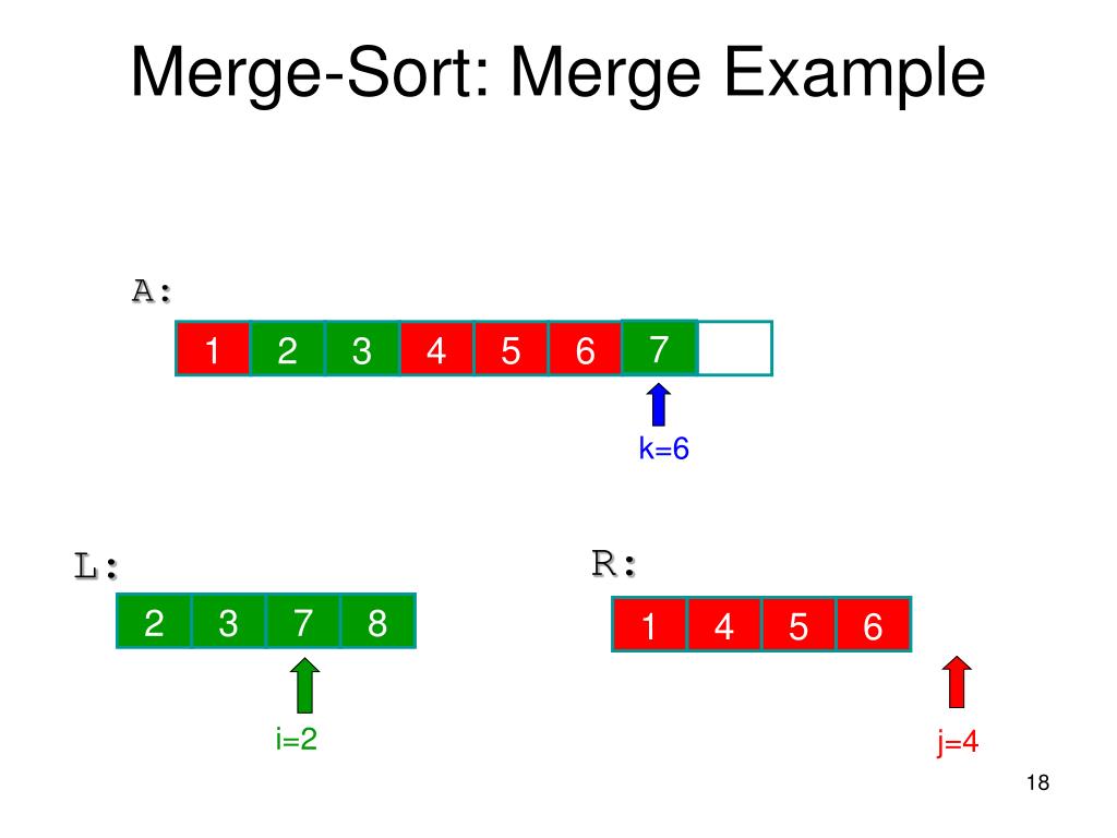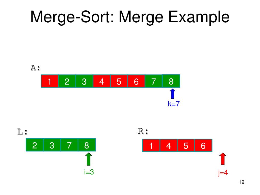 Merge-Sort: Merge Example A: 7 1 2 3 4 5 6 14 k=6 R: L: 2 3 7 8 1 6 10 4 14 5 22 6 i=2 j=4