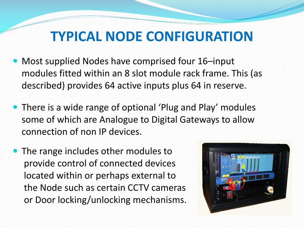 TYPICAL NODE CONFIGURATION • Most supplied Nodes have comprised four 16–input modules fitted within an 8 slot module rack frame. This (as described) provides 64 active inputs plus 64 in reserve. • There is a wide range of optional ‘Plug and Play’ modules some of which are Analogue to Digital Gateways to allow connection of non IP devices. • The range includes other modules to provide control of connected devices located within or perhaps external to the Node such as certain CCTV cameras or Door locking/unlocking mechanisms.