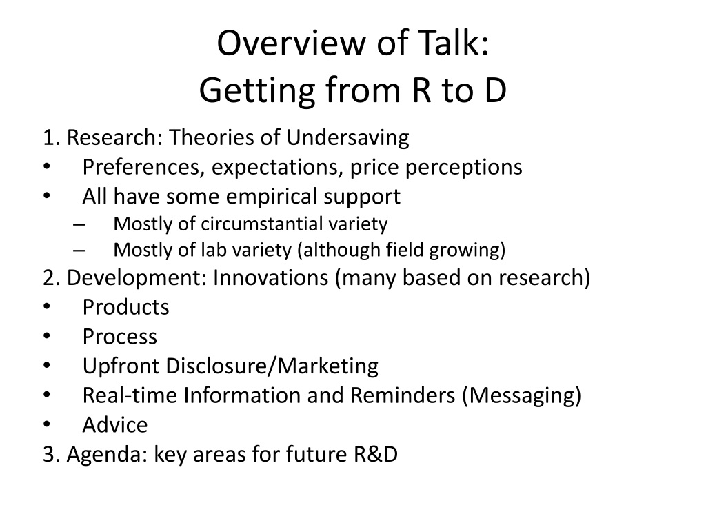 Overview of Talk:Getting from R to D 1. Research: Theories of Undersaving • Preferences, expectations, price perceptions • All have some empirical support • Mostly of circumstantial variety • Mostly of lab variety (although field growing) 2. Development: Innovations (many based on research) • Products • Process • Upfront Disclosure/Marketing • Real-time Information and Reminders (Messaging) • Advice 3. Agenda: key areas for future R&D