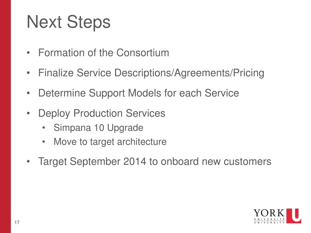 Next Steps • Formation of the Consortium • Finalize Service Descriptions/Agreements/Pricing • Determine Support Models for each Service • Deploy Production Services • Simpana 10 Upgrade • Move to target architecture • Target September 2014 to onboard new customers