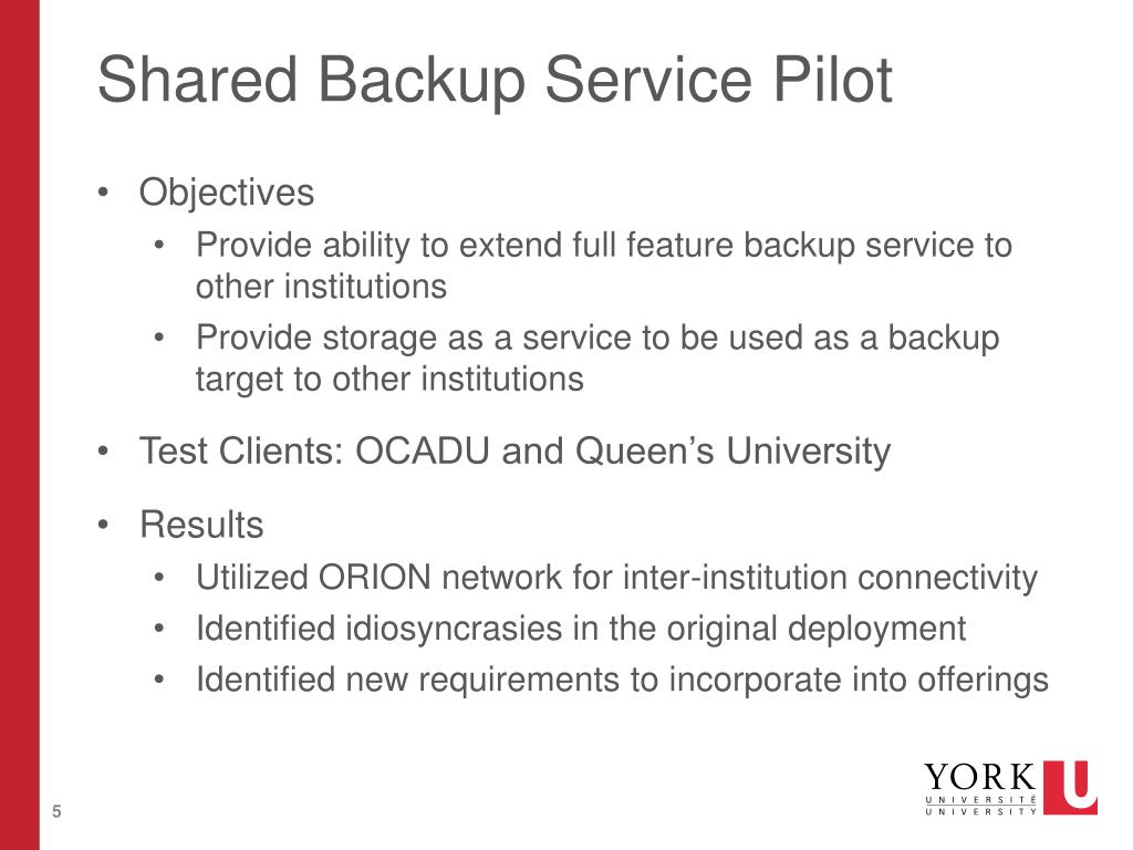 Great Minds Think Alike • October 2013 • MTCU PIF Proposal Submitted • Backup as a Service to consolidate the effort to manage that infrastructure • Leverage the York/Guelph relationship and infrastructure • York, University of Guelph, OCADU, and Queen’s University • December 2013 • Pilot technical team starts • Deadline March 2014 for functional pilot and supporting documentation