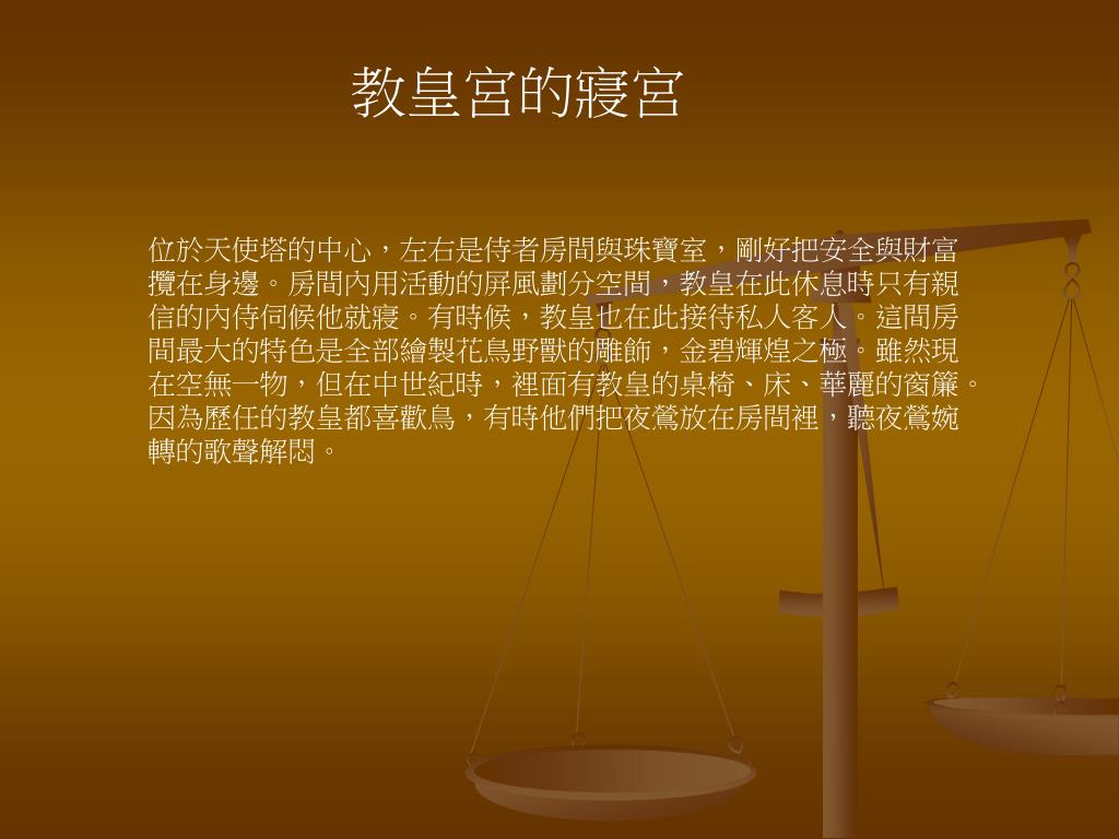 教皇宮的寢宮 位於天使塔的中心,左右是侍者房間與珠寶室,剛好把安全與財富攬在身邊。房間內用活動的屏風劃分空間,教皇在此休息時只有親信的內侍伺候他就寢。有時候,教皇也在此接待私人客人。這間房間最大的特色是全部繪製花鳥野獸的雕飾,金碧輝煌之極。雖然現在空無一物,但在中世紀時,裡面有教皇的桌椅、床、華麗的窗簾。因為歷任的教皇都喜歡鳥,有時他們把夜鶯放在房間裡,聽夜鶯婉轉的歌聲解悶。