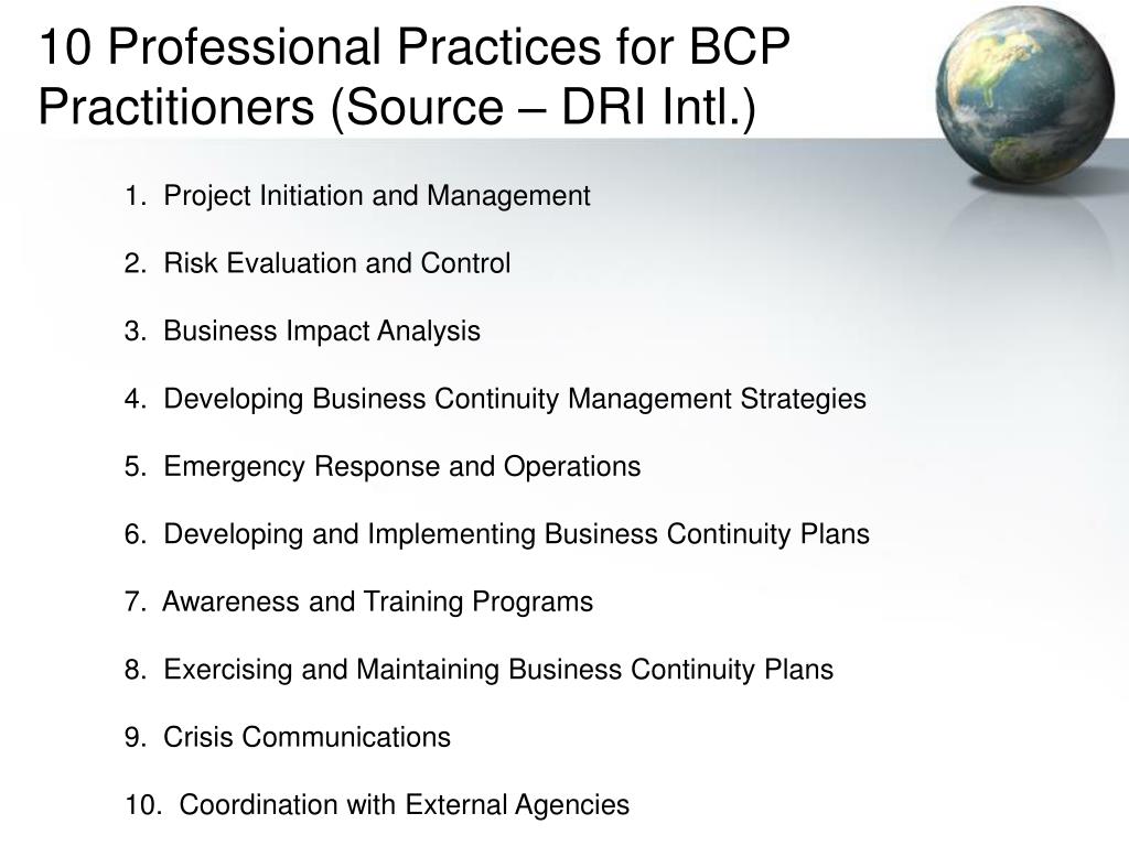 10 Professional Practices for BCP Practitioners (Source – DRI Intl.) 1. Project Initiation and Management 2. Risk Evaluation and Control 3. Business Impact Analysis 4. Developing Business Continuity Management Strategies 5. Emergency Response and Operations 6. Developing and Implementing Business Continuity Plans 7. Awareness and Training Programs 8. Exercising and Maintaining Business Continuity Plans 9. Crisis Communications 10. Coordination with External Agencies