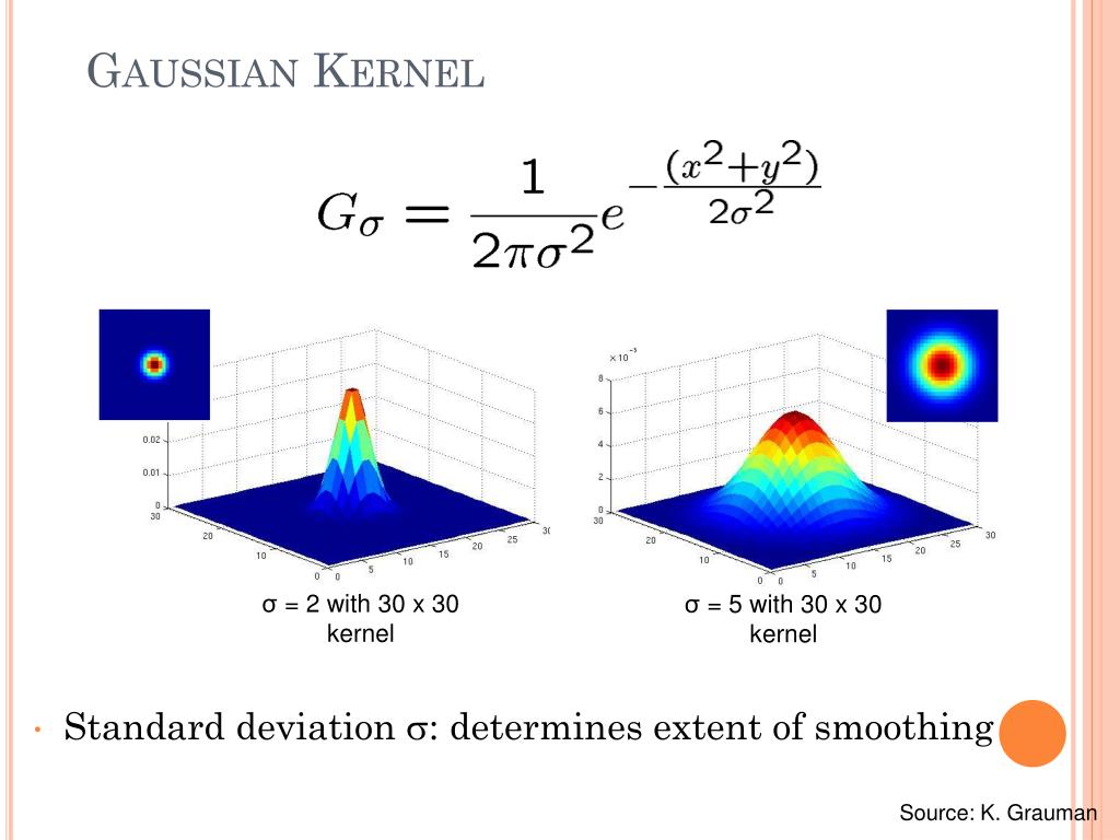 Gaussian Kernel • Standard deviation : determines extent of smoothing σ = 2 with 30 x 30 kernel σ = 5 with 30 x 30 kernel Source: K. Grauman
