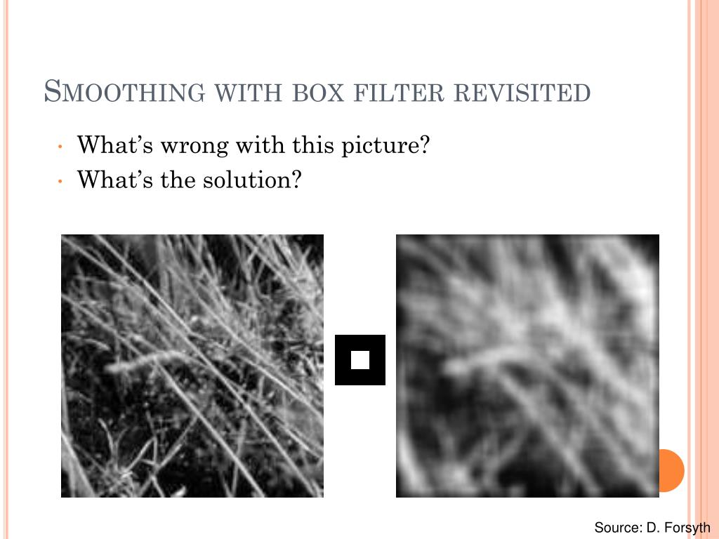 Smoothing with box filter revisited • What’s wrong with this picture? • What’s the solution? Source: D. Forsyth