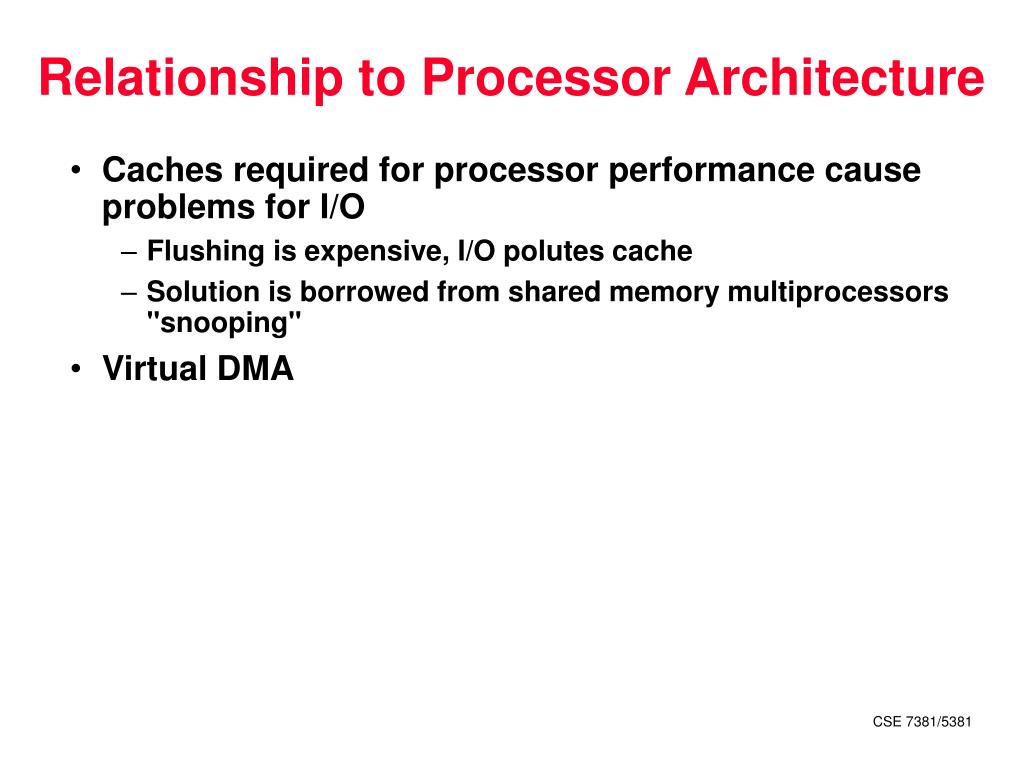 Relationship to Processor Architecture • Caches required for processor performance cause problems for I/O • Flushing is expensive, I/O polutes cache • Solution is borrowed from shared memory multiprocessors "snooping" • Virtual DMA