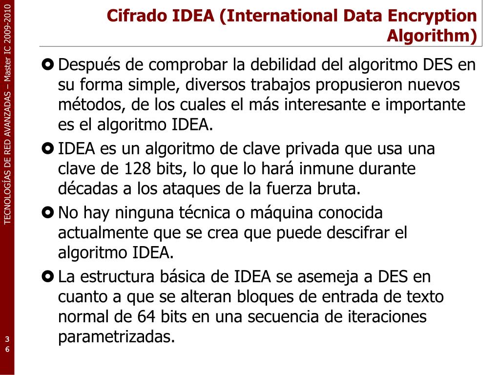 Cifrado IDEA (International Data Encryption Algorithm) • Después de comprobar la debilidad del algoritmo DES en su forma simple, diversos trabajos propusieron nuevos métodos, de los cuales el más interesante e importante es el algoritmo IDEA. • IDEA es un algoritmo de clave privada que usa una clave de 128 bits, lo que lo hará inmune durante décadas a los ataques de la fuerza bruta. • No hay ninguna técnica o máquina conocida actualmente que se crea que puede descifrar el algoritmo IDEA. • La estructura básica de IDEA se asemeja a DES en cuanto a que se alteran bloques de entrada de texto normal de 64 bits en una secuencia de iteraciones parametrizadas.