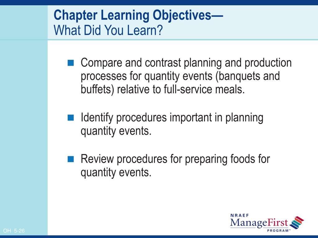 Banquet and Buffet Food Production. Food Production. 5. Chapter Learning Objectives. Compare and contrast planning and production processes for quantity events (banquets and buffets) relative to full-service meals. Identify procedures important in planning quantity events.