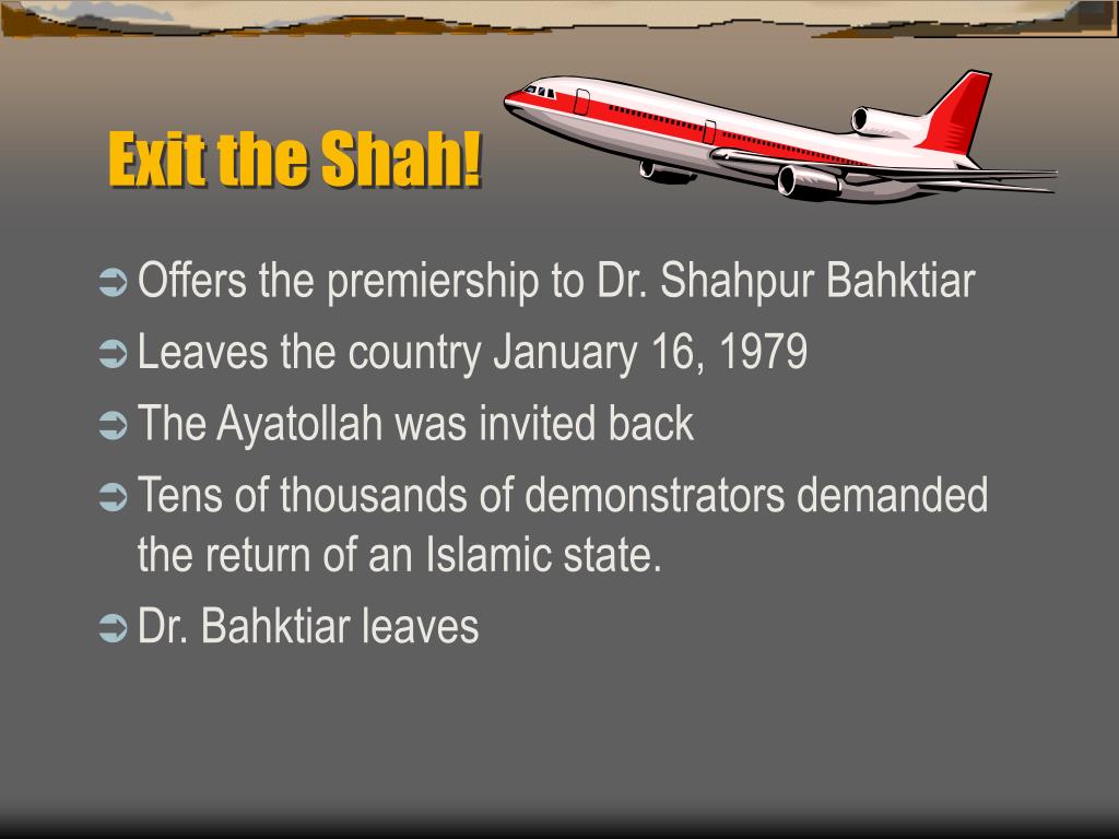 Exit the Shah! • Offers the premiership to Dr. Shahpur Bahktiar • Leaves the country January 16, 1979 • The Ayatollah was invited back • Tens of thousands of demonstrators demanded the return of an Islamic state. • Dr. Bahktiar leaves