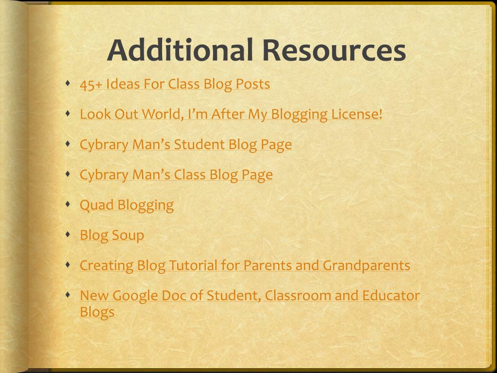 Additional Resources • 45+ Ideas For Class Blog Posts • Look Out World, I’m After My Blogging License! • Cybrary Man’s Student Blog Page • Cybrary Man’s Class Blog Page • Quad Blogging • Blog Soup • Creating Blog Tutorial for Parents and Grandparents • New Google Doc of Student, Classroom and Educator Blogs