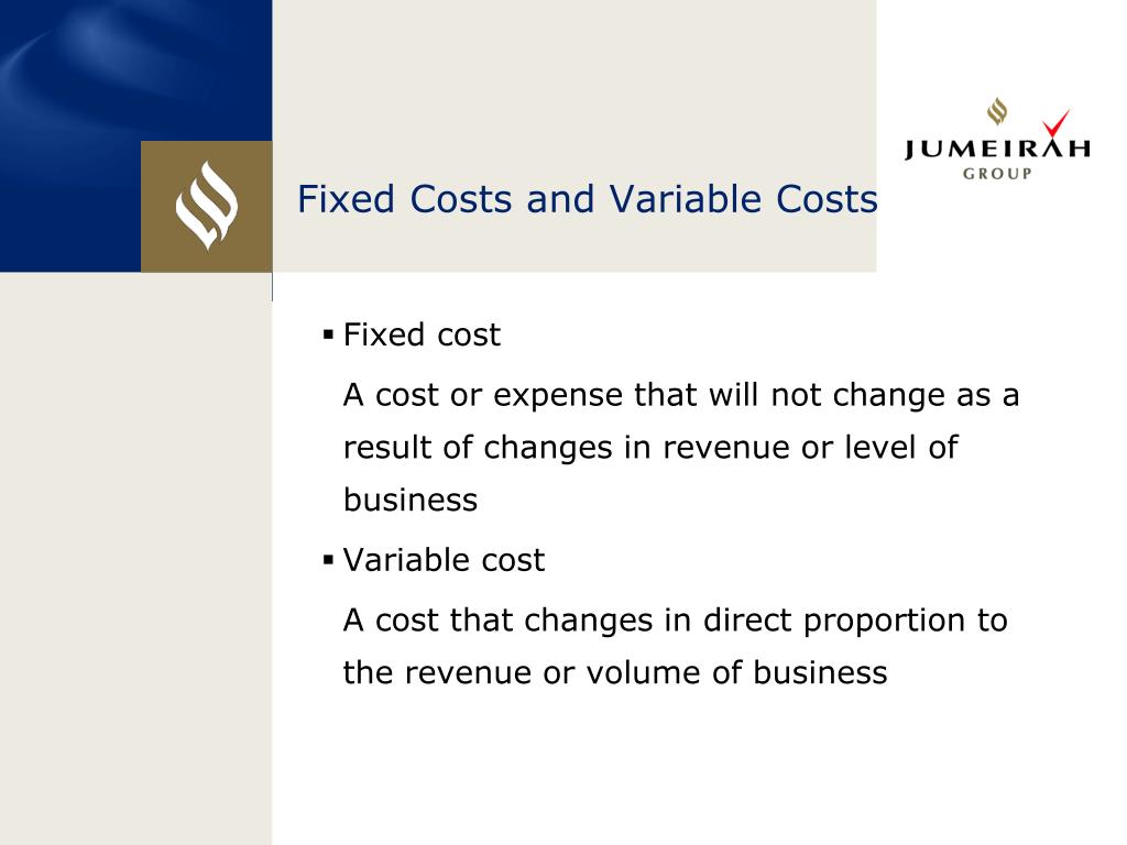 Fixed Costs and Variable Costs • Fixed cost A cost or expense that will not change as a result of changes in revenue or level of business • Variable cost A cost that changes in direct proportion to the revenue or volume of business