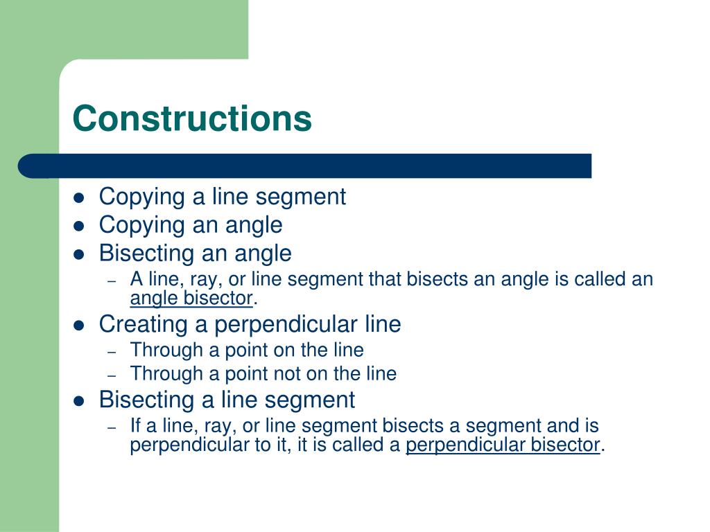 Constructions • Copying a line segment • Copying an angle • Bisecting an angle • A line, ray, or line segment that bisects an angle is called an angle bisector. • Creating a perpendicular line • Through a point on the line • Through a point not on the line • Bisecting a line segment • If a line, ray, or line segment bisects a segment and is perpendicular to it, it is called a perpendicular bisector.