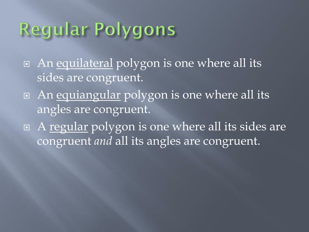 Regular Polygons • An equilateral polygon is one where all its sides are congruent. • An equiangular polygon is one where all its angles are congruent. • A regular polygon is one where all its sides are congruent and all its angles are congruent.