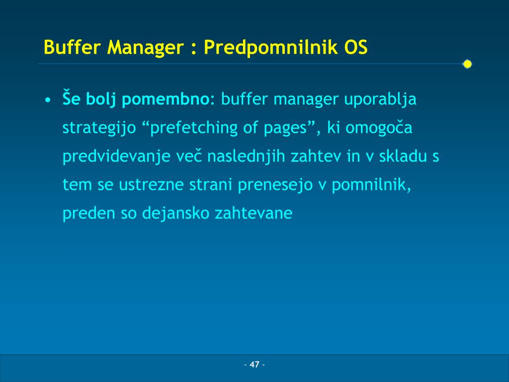 Buffer Manager : Predpomnilnik OS • Še bolj pomembno: buffer manager uporablja strategijo “prefetching of pages”, ki omogoča predvidevanje več naslednjih zahtev in v skladu s tem se ustrezne strani prenesejo v pomnilnik, preden so dejansko zahtevane - 47 -
