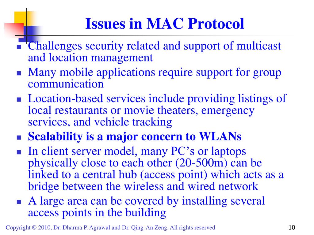 Issues in MAC Protocol • Challenges security related and support of multicast and location management • Many mobile applications require support for group communication • Location-based services include providing listings of local restaurants or movie theaters, emergency services, and vehicle tracking • Scalability is a major concern to WLANs • In client server model, many PC’s or laptops physically close to each other (20-500m) can be linked to a central hub (access point) which acts as a bridge between the wireless and wired network • A large area can be covered by installing several access points in the building