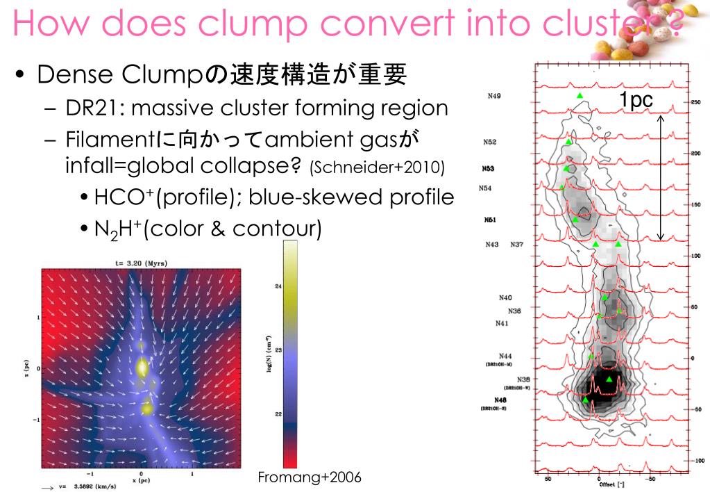 How does clump convert into cluster ? 1pc • Dense Clumpの速度構造が重要 • DR21: massive cluster forming region • Filamentに向かってambient gasがinfall=global collapse? (Schneider+2010) • HCO+(profile); blue-skewed profile • N2H+(color & contour) Fromang+2006