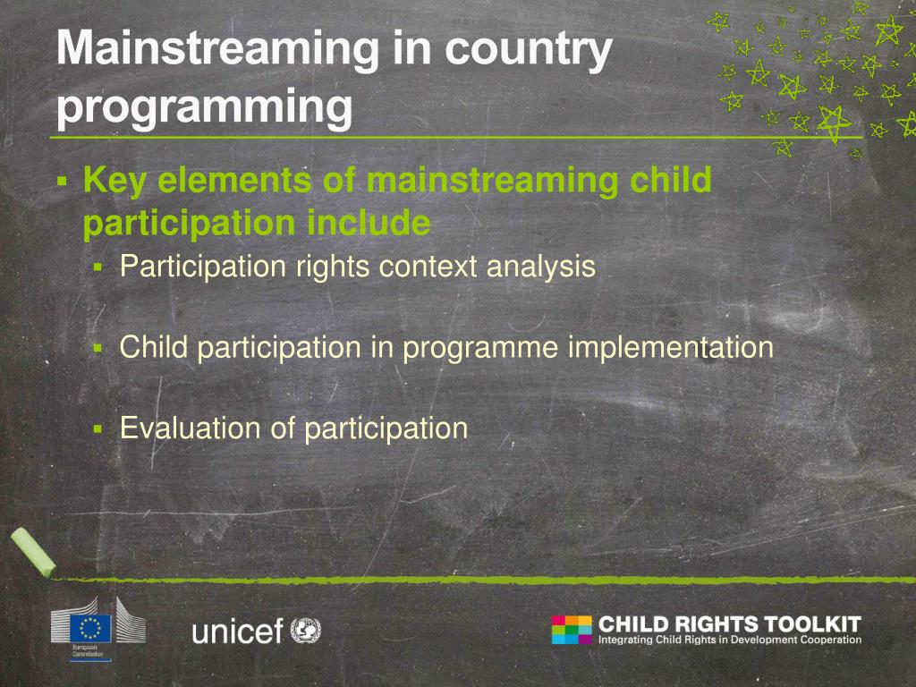 Mainstreaming in country programming • Key elements of mainstreaming child participation include • Participation rights context analysis • Child participation in programme implementation • Evaluation of participation