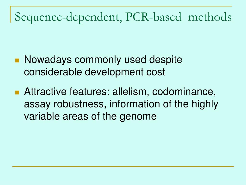 Sequence-dependent, PCR-based methods • Nowadays commonly used despite considerable development cost • Attractive features: allelism, codominance, assay robustness, information of the highly variable areas of the genome