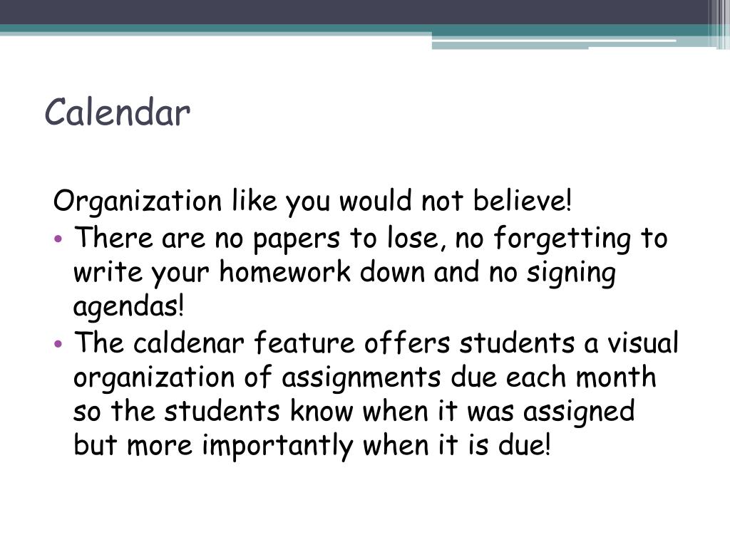 Calendar Organization like you would not believe! • There are no papers to lose, no forgetting to write your homework down and no signing agendas! • The caldenar feature offers students a visual organization of assignments due each month so the students know when it was assigned but more importantly when it is due!