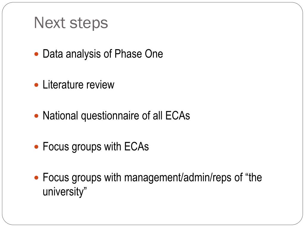 Next steps • Data analysis of Phase One • Literature review • National questionnaire of all ECAs • Focus groups with ECAs • Focus groups with management/admin/reps of “the university”
