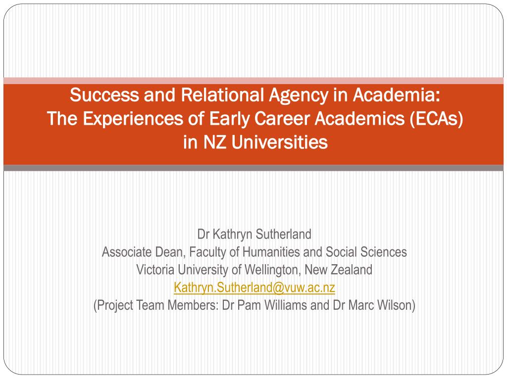 Success and Relational Agency in Academia: The Experiences of Early Career Academics (ECAs) in NZ Universities. Dr Kathryn Sutherland Associate Dean, Faculty of Humanities and Social Sciences Victoria University of Wellington, New Zealand Kathryn.Sutherland@vuw.ac.nz
