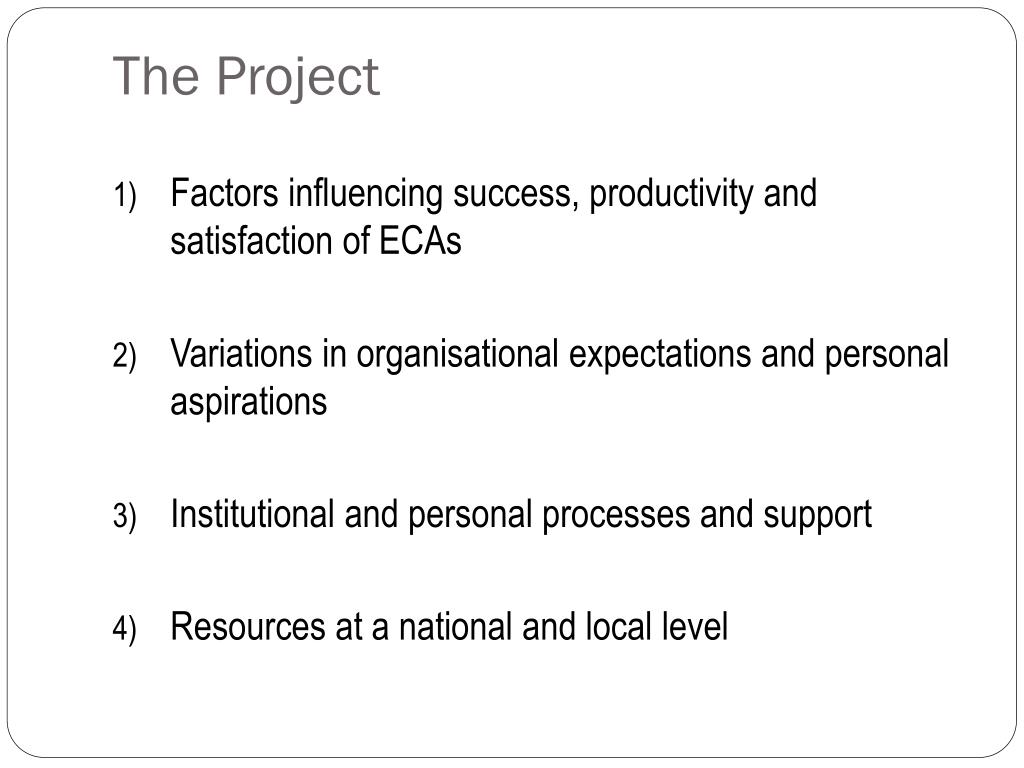The Project • Factors influencing success, productivity and satisfaction of ECAs • Variations in organisational expectations and personal aspirations • Institutional and personal processes and support • Resources at a national and local level