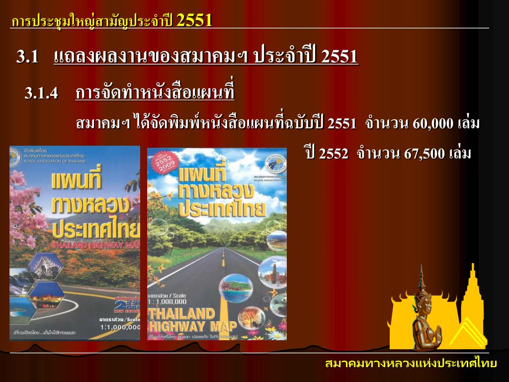 การประชุมใหญ่สามัญประจำปี2551การประชุมใหญ่สามัญประจำปี2551 3.1 แถลงผลงานของสมาคมฯ ประจำปี 2551 3.1.4 การจัดทำหนังสือแผนที่ สมาคมฯ ได้จัดพิมพ์หนังสือแผนที่ฉบับปี 2551 จำนวน 60,000 เล่ม ปี 2552 จำนวน 67,500 เล่ม สมาคมทางหลวงแห่งประเทศไทย